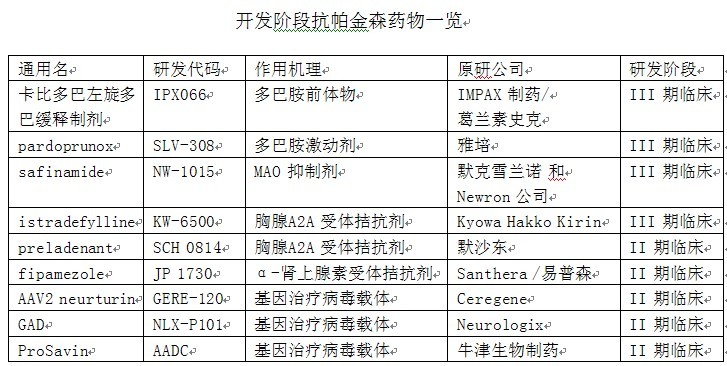 目前已上市的帕金森病治療藥仍不能滿足臨床需求。在整個治療過程中,沒有一種單一的治療方法完全有效;因此應根據疾病不同階段及病情的嚴重程度進行針對性治療。